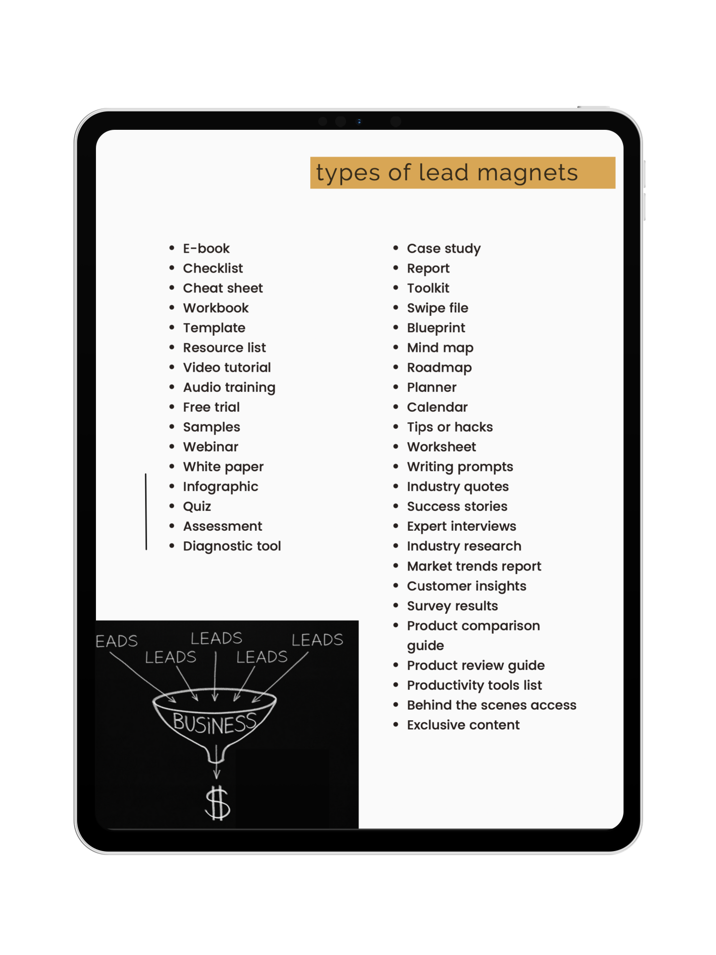 OVER 30 different industries on this list; 240+ lead magnets ideas, and a bonus list of 40 types of lead magnets!